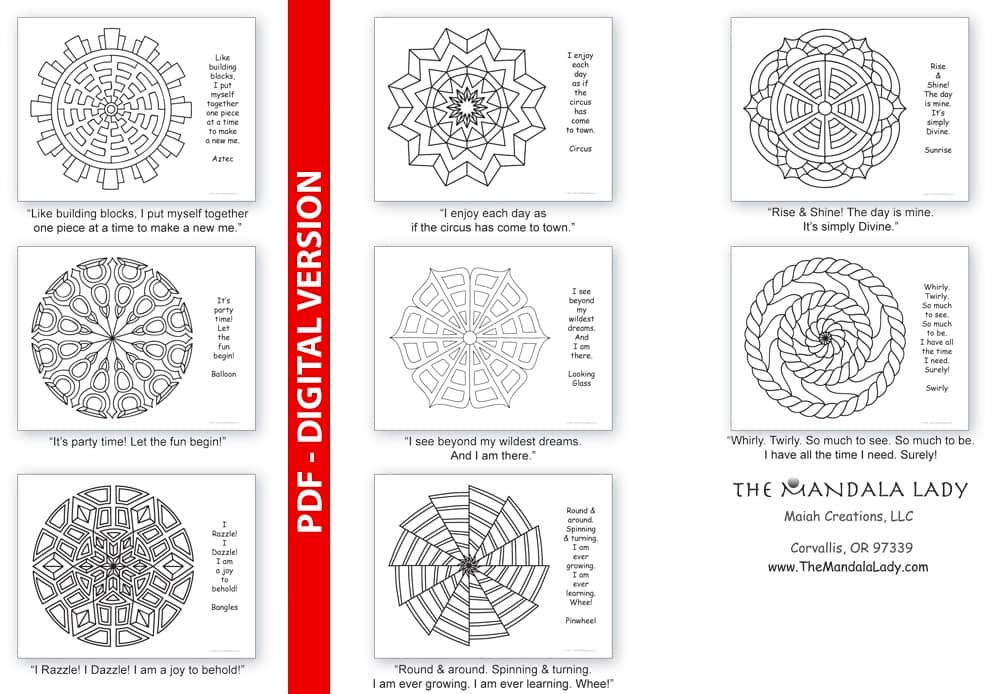 Awaken your creative spirit in a delightful, inspiring way with this 11" x 8.5" PDF Mandala Coloring Book containing 8 original symmetry mandalas by Maureen Frank while in meditation, with simpler, more-like themes, and each with its own unique message.