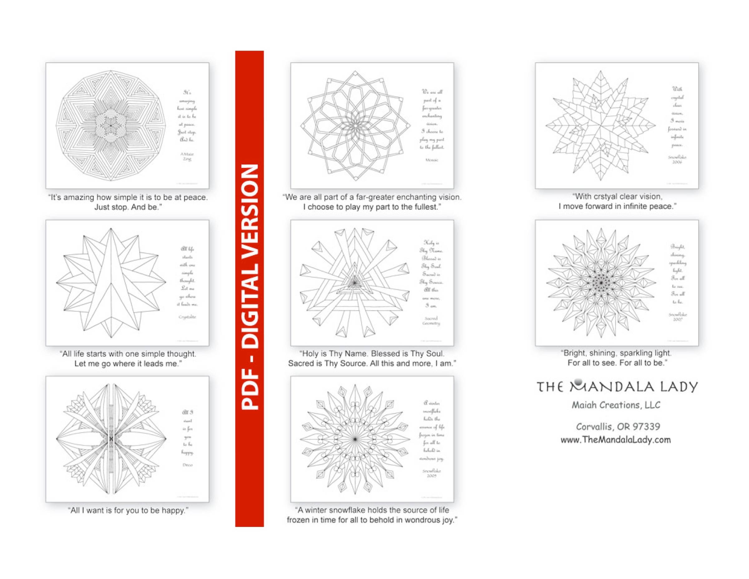 Awaken your creative spirit in a delightful, inspiring way with this 11" x 8.5" PDF Mandala Coloring Book containing 8 original geometric-styled symmetry mandalas by Maureen Frank while in meditation and each comes with its own message.