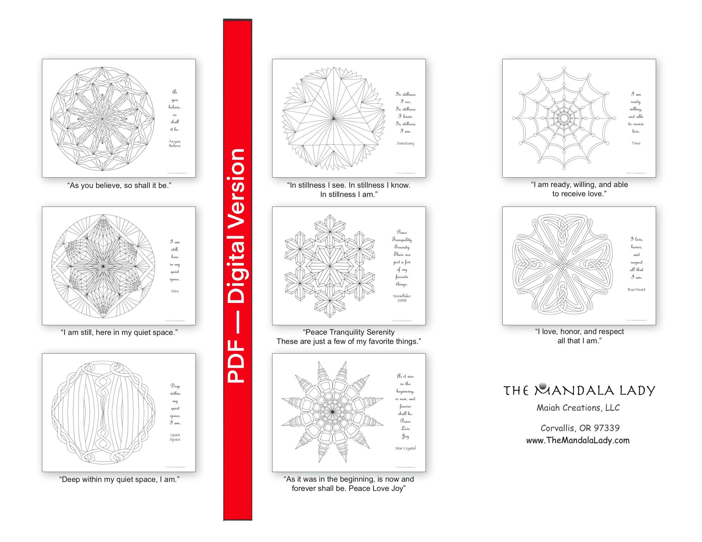 Awaken your creative spirit in a delightful, inspiring way with this 11" x 8.5" PDF Mandala Coloring Book containing 8 original symmetry mandalas by Maureen Frank (me) while in meditation, each with with a quiet space theme and its own unique message.